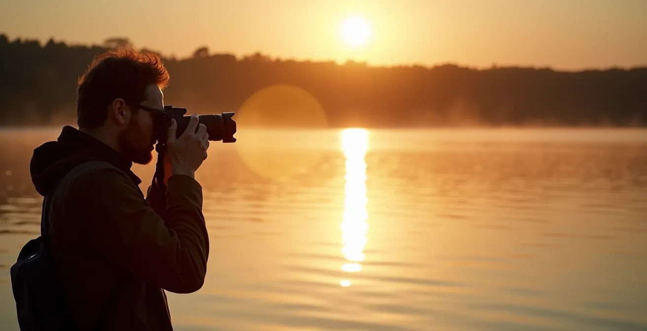 La maîtrise du polarisant ne s’arrête pas à le visser sur l’objectif. Son efficacité dépend crucialement de l’angle. L’effet est maximal lorsque l’axe de votre objectif forme un angle d’environ 30 à 40 degrés avec la surface réfléchissante. Pour l’utiliser correctement, cadrez votre sujet, puis tournez lentement la bague du filtre en observant l’effet dans le viseur ou sur l’écran LiveView. Vous verrez littéralement les reflets s’atténuer ou disparaître, et les couleurs devenir plus denses et saturées, car le filtre supprime également le voile atmosphérique.