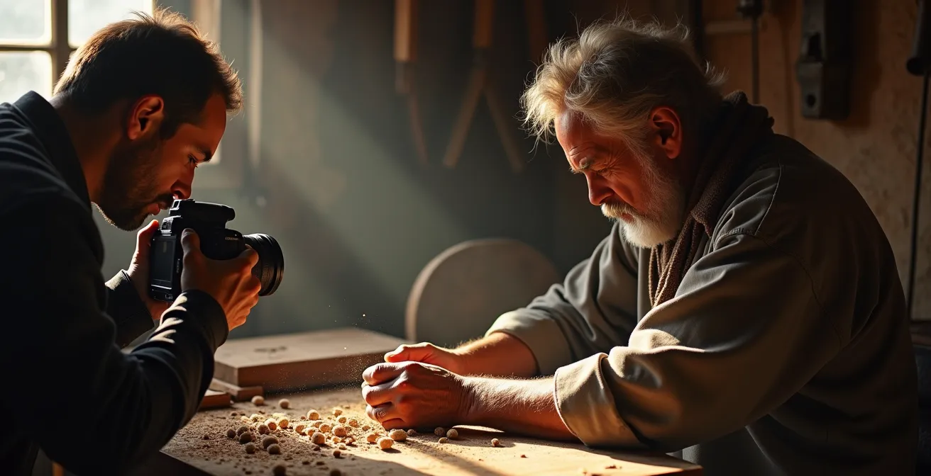 La lumière est le premier outil pour créer cette atmosphère. Préférez la lumière naturelle d’une fenêtre d’atelier, qui sculpte les formes et crée des clairs-obscurs. Ces zones d’ombre ne sont pas des défauts ; elles ajoutent du mystère, de la profondeur et concentrent le regard sur le geste ou le détail éclairé. De même, le cadre ne doit pas être un studio neutre, mais l’atelier lui-même. Le « désordre maîtrisé », les outils patinés par l’usage, les copeaux de bois au sol, les taches de peinture : tout cela constitue le vocabulaire de votre histoire. Ce sont les preuves d’un lieu qui vit et respire le travail manuel.